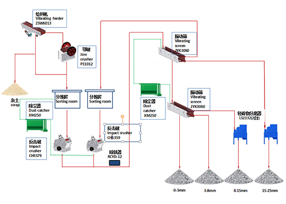 固定式建筑垃圾處理生產(chǎn)線流程: 運(yùn)送來的建筑廢料首先進(jìn)行分揀,經(jīng)分揀后可破碎物料進(jìn)入振動(dòng)篩,由初級(jí)篩分設(shè)備將其分為兩部分,篩上粗料送入反擊式破碎機(jī)進(jìn)一步破碎,破碎后的物料經(jīng)磁力除鐵器除去塊狀鐵質(zhì)物質(zhì)。破碎后的物料還可被分成不同用途、不同粒徑無機(jī)混合集料,如德國在固定式的建筑廢料回收處理工廠中按照德國標(biāo)準(zhǔn)DIN4226的要求將回收的建筑廢料加工成0~32mm、0~45mm、0~65mm的無機(jī)混合集料,并可提供用于特殊需要場合的、有要求級(jí)配的顆粒狀集料,如O~8mm、8~16mm、16~32mm的級(jí)配集料等。